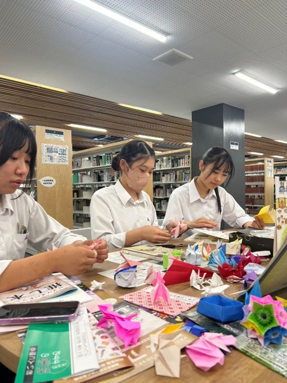 10月6日(月)の中秋の名月に合わせて、9月30日(火)から10月6日(月)までの期間、図書館にて「図書館 DE 折り紙『月のうさぎ』」イベントを開催しました。参加した生徒たちは、うさぎや鶴などを思い思いに折り、折り紙を通して季節の移ろいを感じていました。