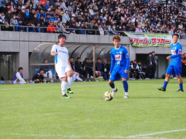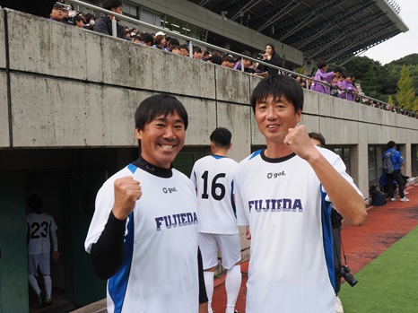 また、準決勝前日には藤枝総合運動公園サッカー場にて、「宝くじスポーツフェア ドリームサッカー in 藤枝」が開催されました。本校サッカー部の植松監督、小林コーチ、そして藤枝明誠高校の監督・コーチも「藤枝市選抜チーム」として出場し、日本代表OBチームを相手に熱いプレーを繰り広げました。顧問の先生方の高い技術と情熱も、改めて感じられる試合となりました。