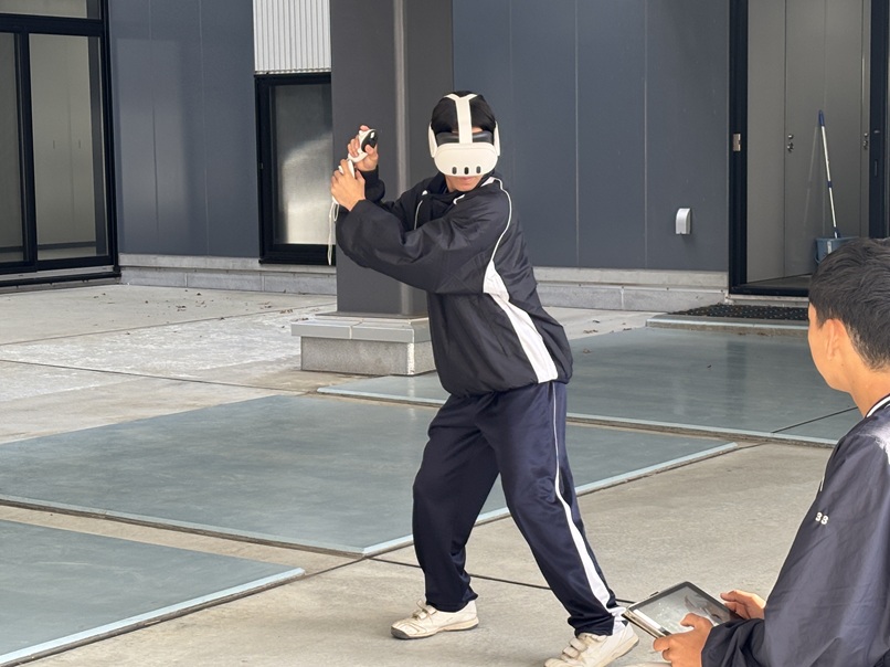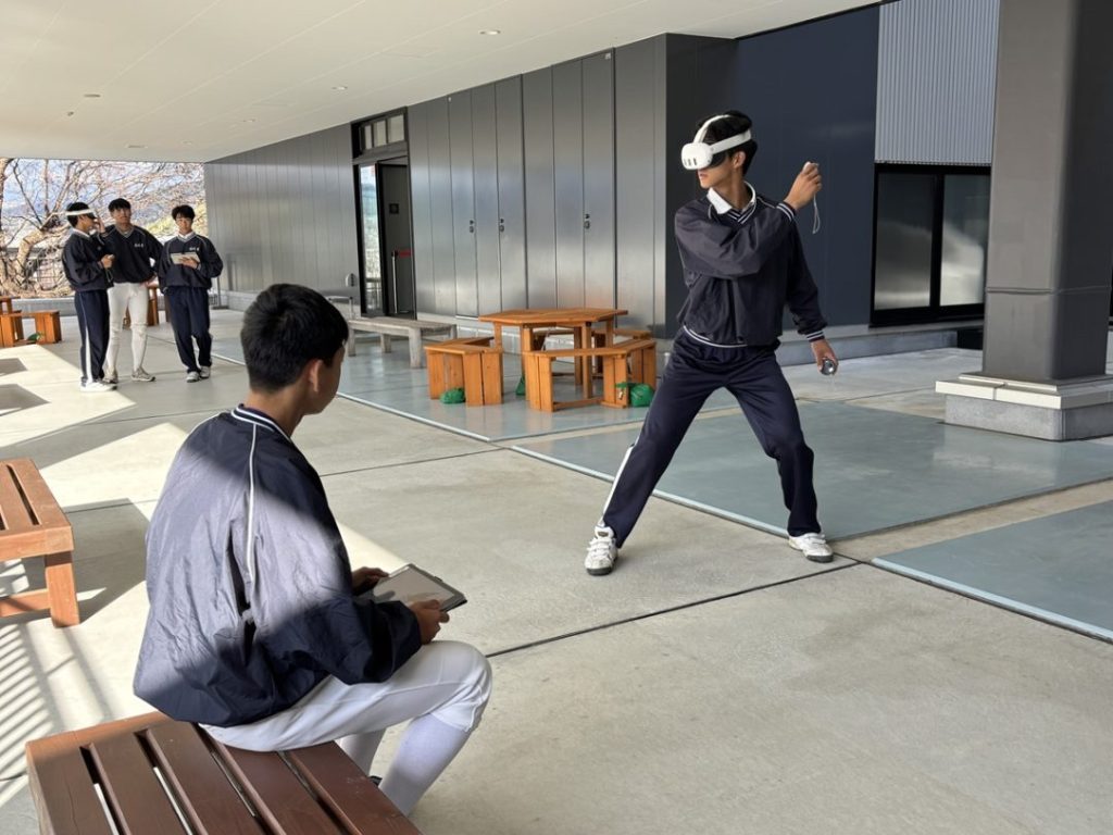 しかし、いつもの素振り練習とは何やら様子が違います。バッティングのような動作ですが、頭にはVRゴーグルを被り、手にはバットではなくコントローラーのようなものを持っています。その横では別の部員がタブレットの画面を睨んでいます。