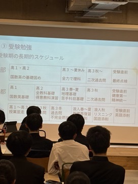 今年は、1年生17名、2年生19名の計36名の希望者が参加しました。テーマは「攻める受験」。現役東大生から、受験に向き合う姿勢や日々の学習の工夫について、実体験に基づいた具体的なアドバイスを直接聞く貴重な機会となりました。