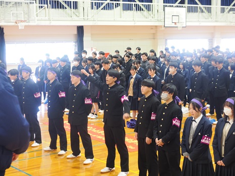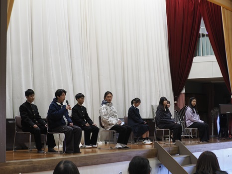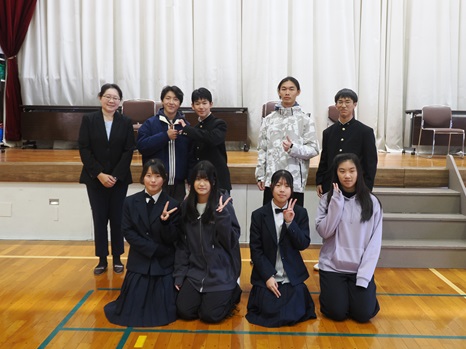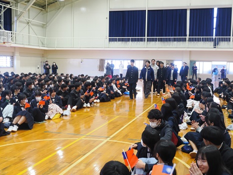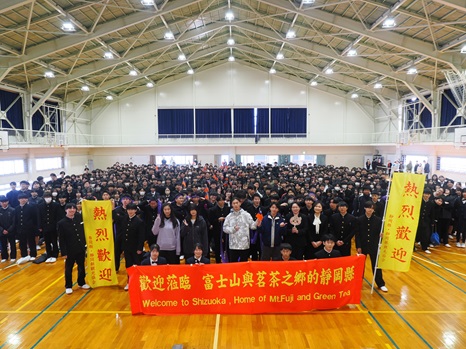 1月26日(月)には、台南女子中の先生に引率されて4名の留学生が来校し、歓迎セレモニーを行いました。留学生たちは緊張した様子ながらも、日本語で丁寧に挨拶をしてくれました。校長先生、生徒会長からの歓迎の言葉に続き、応援団から中国語でのエールが送られ、最後に全体で記念撮影を行いました。
