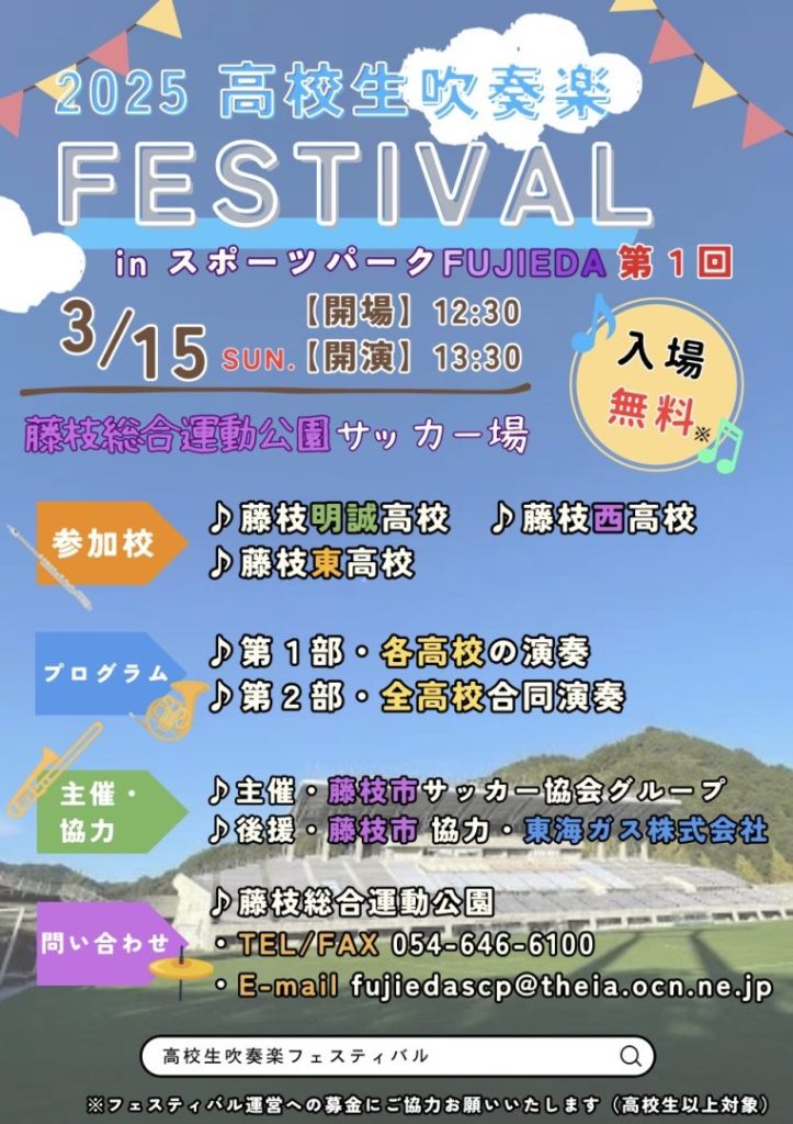 また、3月15日(日)には藤枝総合運動公園サッカー場にて吹奏楽フェスティバルが開催され、本校音楽部も出演します。他校とのコラボレーション演奏も予定されており、聴きごたえのある野外コンサートとなりそうです。入場は無料です。ぜひ会場に足をお運びいただき、音楽部の熱い演奏をお楽しみください!