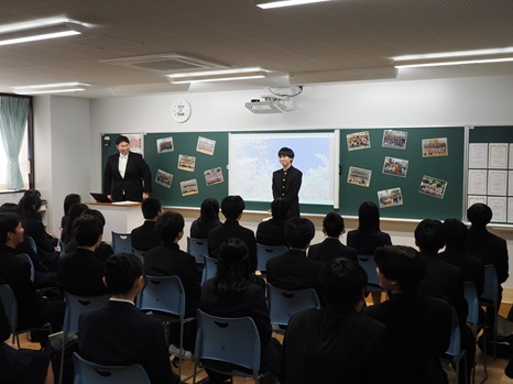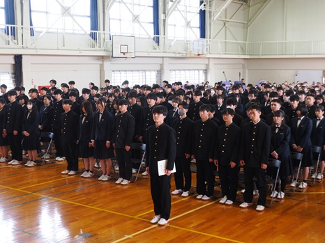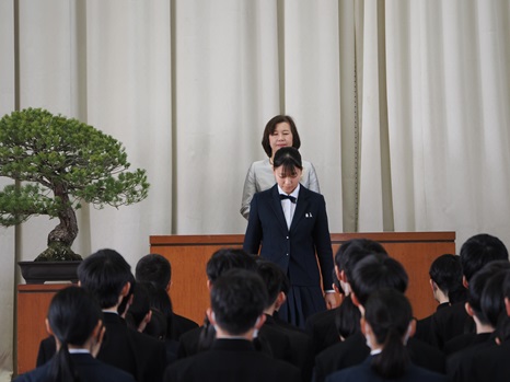 在校生を代表して生徒会長田中凰介さんが送辞を述べ、学校行事や日常の学校生活における先輩方との思い出に触れながら、感謝の意を表しました。これに対し、卒業生代表の菅美優さんが答辞を述べ、部活動や学校行事での経験、仲間への感謝の思い、さらに創立100周年記念事業として参加したアメリカ研修での学びが進路選択に大きな影響を与えたことなどを、真摯な言葉で語りました。